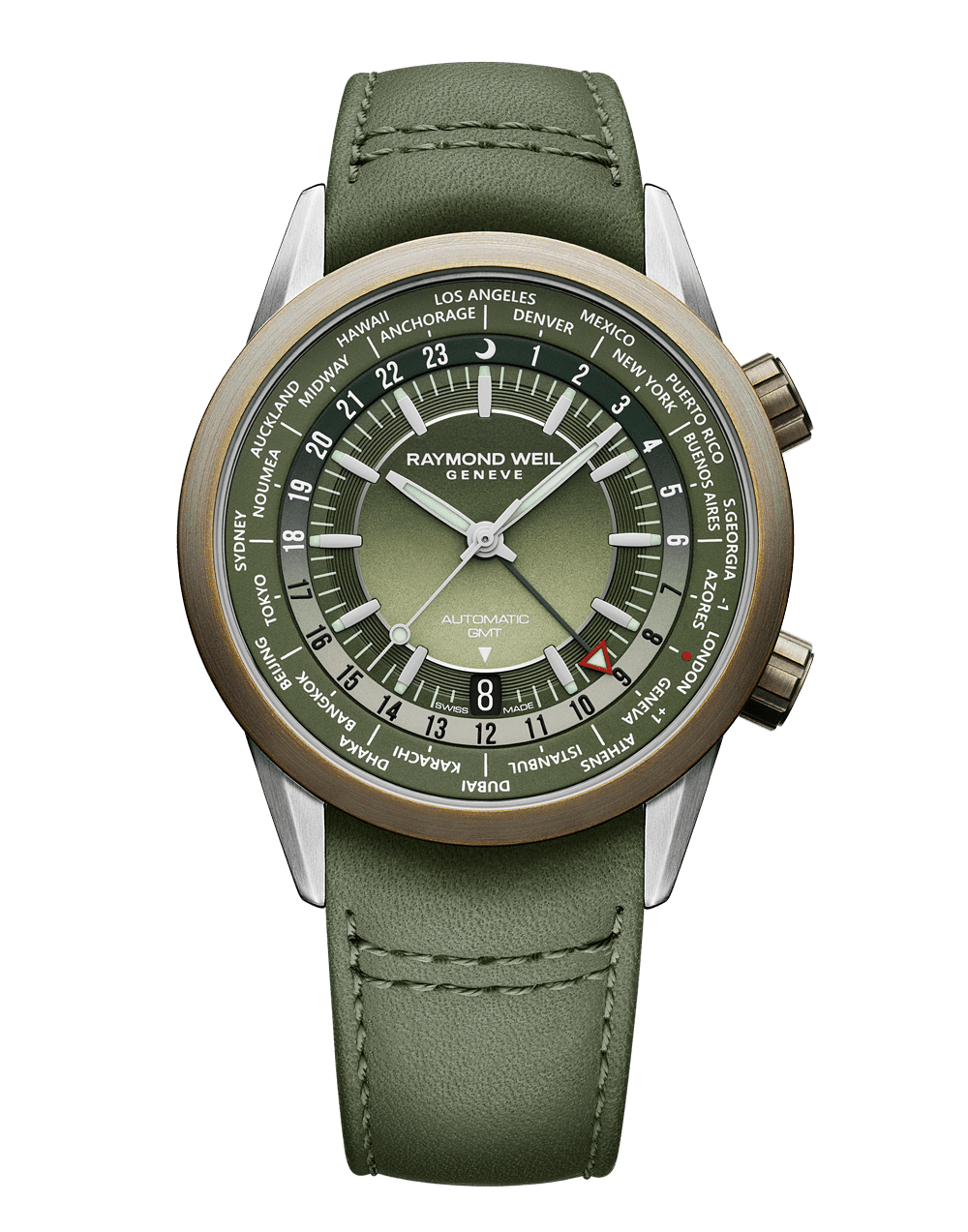 Freelancer Men's GMT Worldtimer Green Dial Leather Strap Watch, 41mm