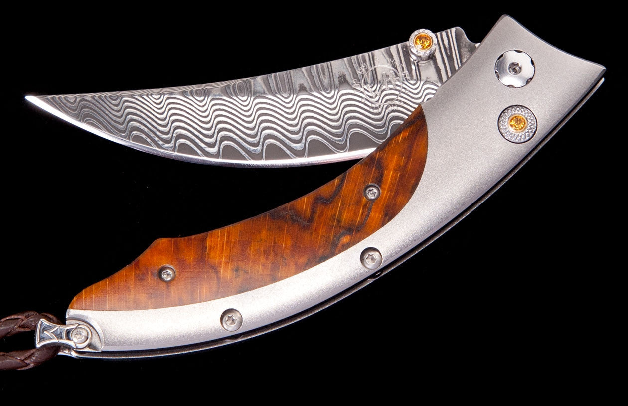 The Persian 'Drift' features a sleek frame in aerospace grade titanium, inlaid with orange spalted beechwood. The blade is 'Wave' damascus steel with a core in extra strong ZDP-189. The one-hand button lock and the thumb stud are set with citrine gem stones. The Persian is an elegant synthesis of dramatic lines, graceful curves, and exquisite materials. A bold interpretation of a timeless design, the 'Drift' also features some of the hi-tech materials and hand-forged metals that are the hallmark of William Henry's collections; a timeless heirloom to be proudly worn and used for a lifetime.