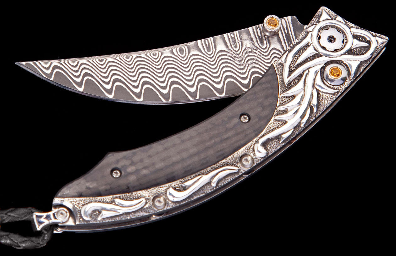 The Persian 'Glide' features a beautiful frame in hand-carved sterling silver, inlaid with carbon fiber. The blade is 'Wave' damascus steel with an extra strong core of ZDP-189. The one-hand button lock and the thumb stud are set with citrine gemstones.Â