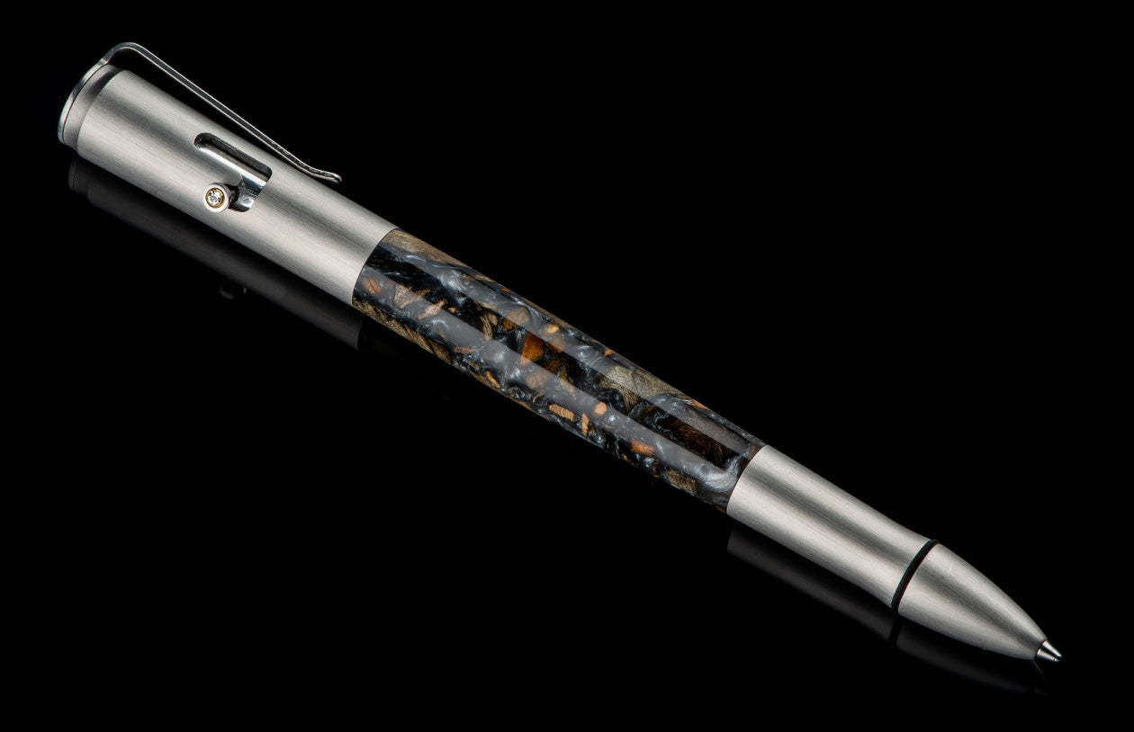 A sleek and elegant pen that writes beautifully, carries comfortably and catches the eye. The 'Fusion' features our bolt action mechanism, inspired by bolt action rifles, which locks open and spring releases closed €“ and yes, it's a lot of fun to play with. The barrel is crafted from crushed wood in silver acrylic, and trim accents are all in stainless steel. Both the thumb stud (on the bolt action system) and the top of the pen are inlaid with white topaz gemstones. Modern mechanics, clean lines and timeless craftsmanship.