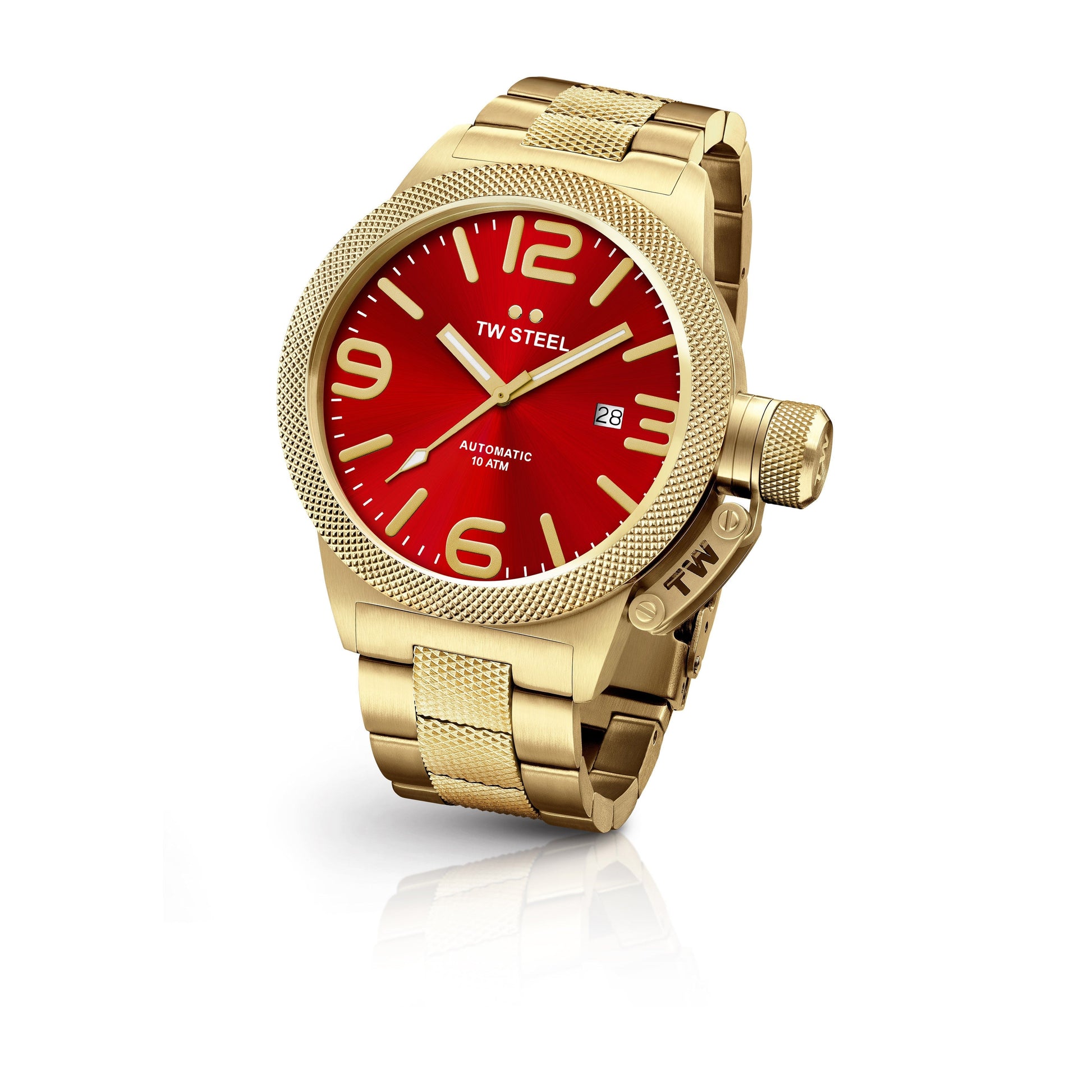 TW Steel Canteen 50mm Steel PVD Yellow Gold Plated Automatic Sunray Red On Bracelet CB116