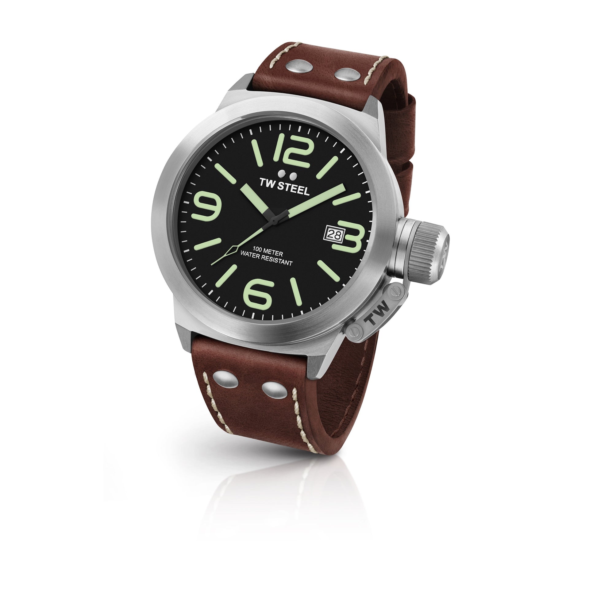 TW Steel Canteen 50mm Steel Black With Luminous Green On Leather Strap CS22
