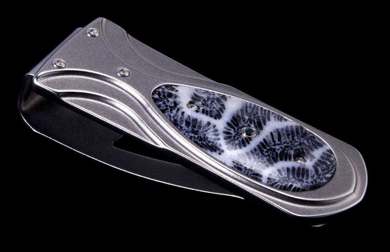The Zurich €˜Aruba' is a beautiful money clip featuring an aerospace grade titanium body, inlaid with 100,000-year-old fossil coral and blue topaz.