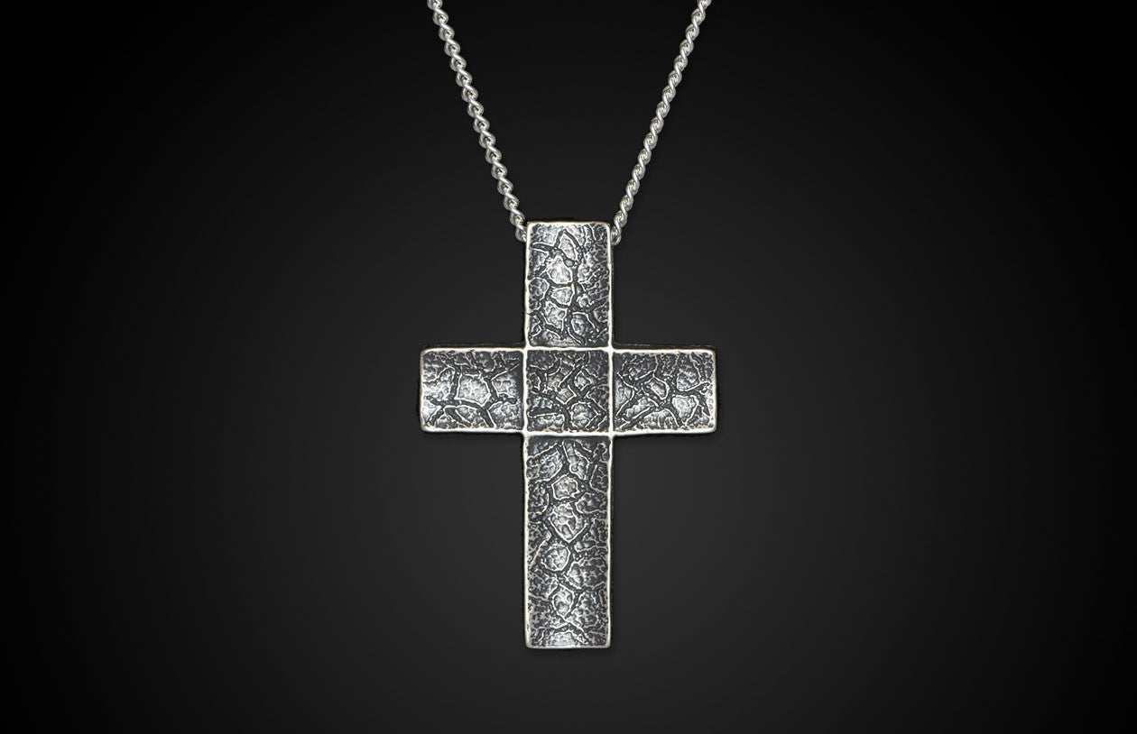 The Unum speaks for itself. A smaller and lighter version of our distinctive cross with hand-cut patterning in sterling silver, on a simple sterling silver curb chain.