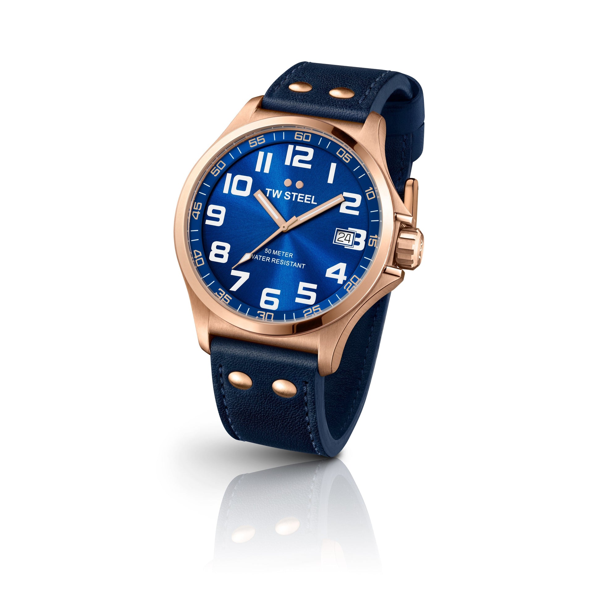 TW Steel Pilot 45mm PVD Rose Gold Plated Blue On Leather Strap TW404
