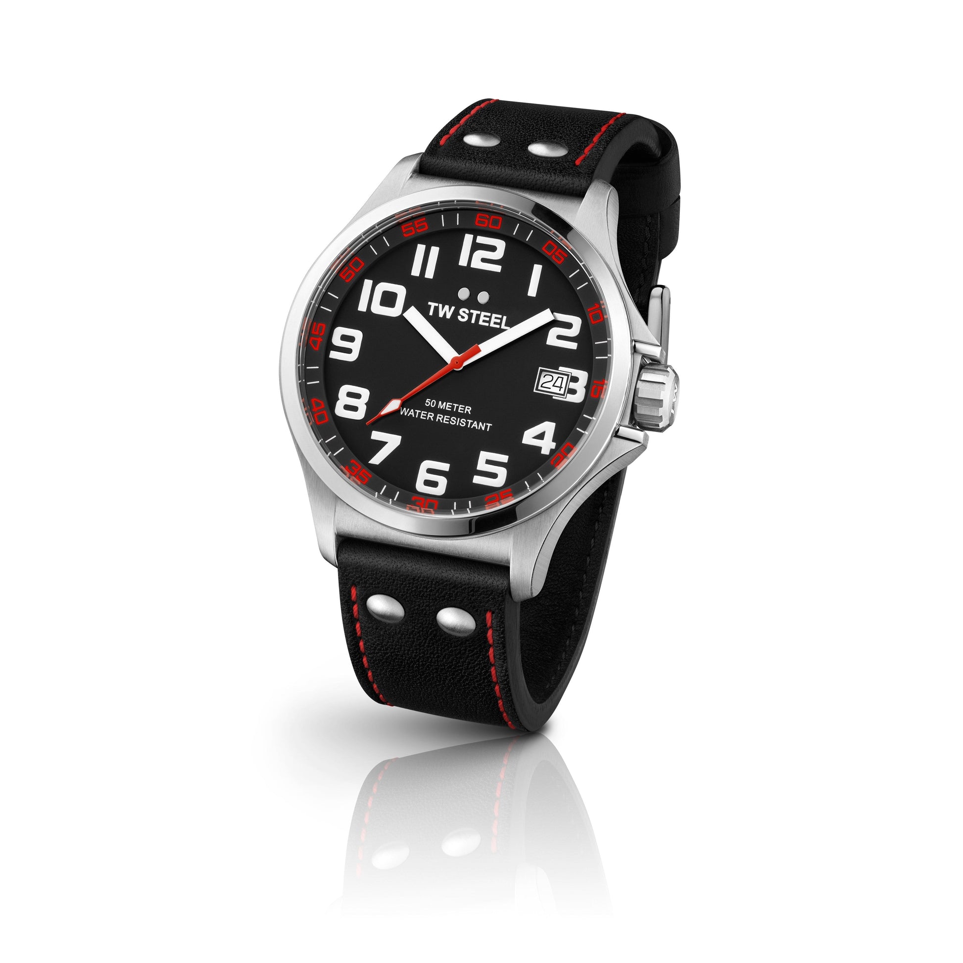 TW Steel Pilot 45mm Steel Black With Red Accents On Leather Strap TW410